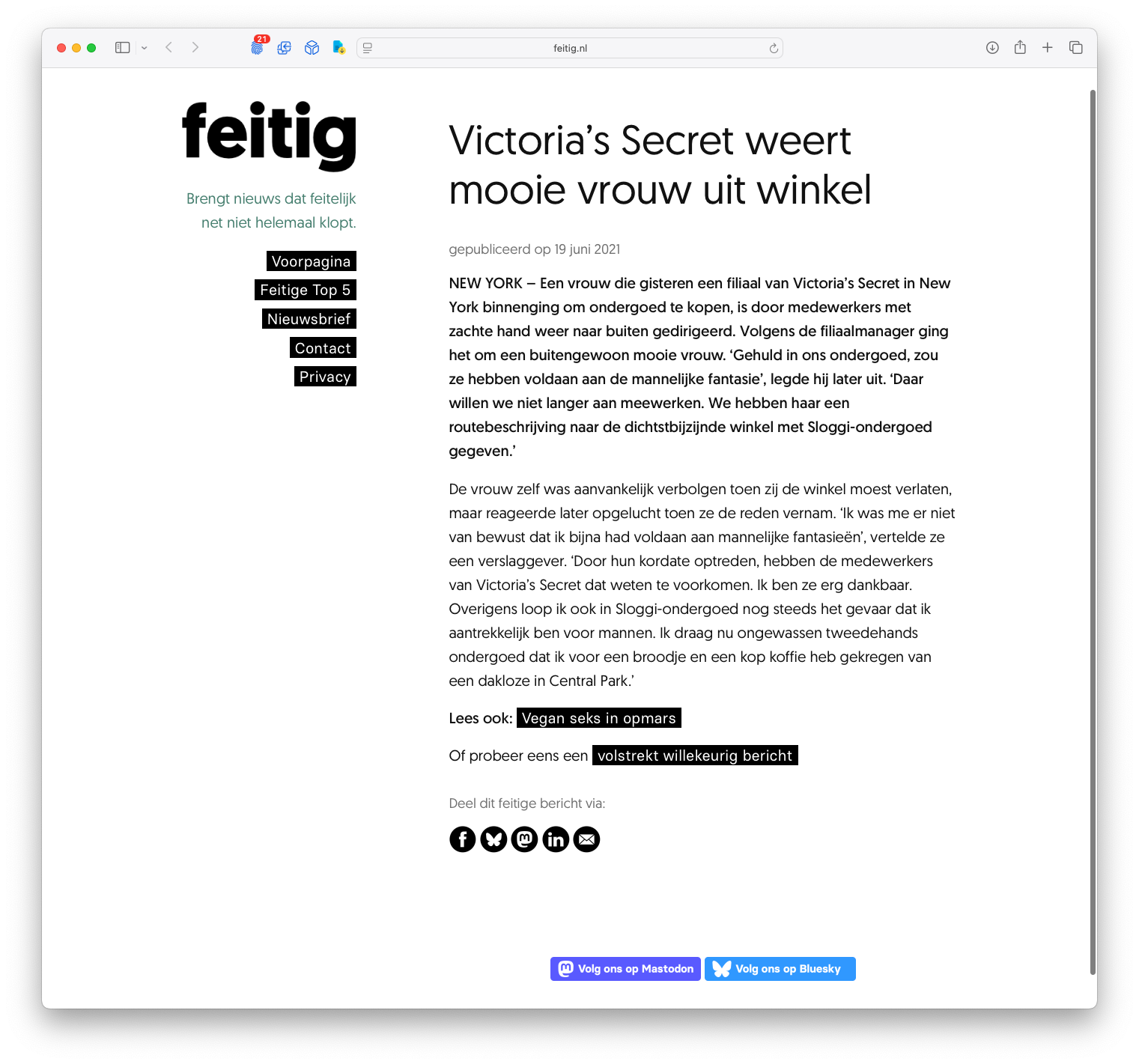 Het feitige bericht waar lezers het meeste tijd aan spenderen, gaat over Victoria Secret. Maar liefst 8 minuten en 59 seconden spenderen lezers gemiddeld op die pagina. Het artikel heeft maar twee alinea’s en heb je in dertig seconden gelezen, dus wij vermoeden dat sommige lezers eindeloos heen en weer scrollen om te zien of er écht nergens een foto van de genoemde mooie vrouw staat. (Helaas: de Feitig-website doet niet aan plaatjes.)
